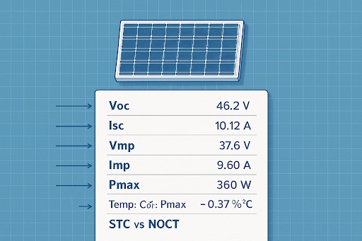 | VMP و IMP (در نقطه توان ماکزیمم) | ولتاژ و جریان واقعی پنل در نقطه بهینه عملکرد | محاسبه توان واقعی خروجی، تطبیق با اینورتر MPPT و طراحی دقیق سیستم |